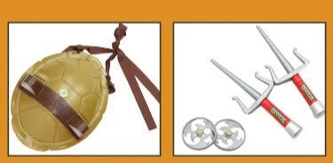 Inclui camisa, calça, faixa para os olhos, casco da tartaruga e armas de brinquedo.